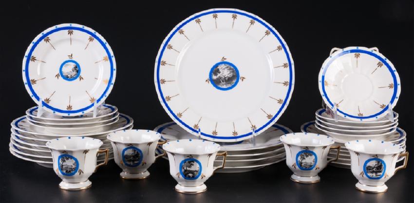 Robert Haviland Le Tanneur Limoges partial dinnerware, blue and gold gilt with pictorial & landscape transfer, of approximately thirty one pieces to include: five dinner plates, six luncheon plates, six salad plates, four bread and butter plates, five saucers and five cups; dinner plates measure approximately 10" in diameter. Marked. All with age appropriate wear & use.