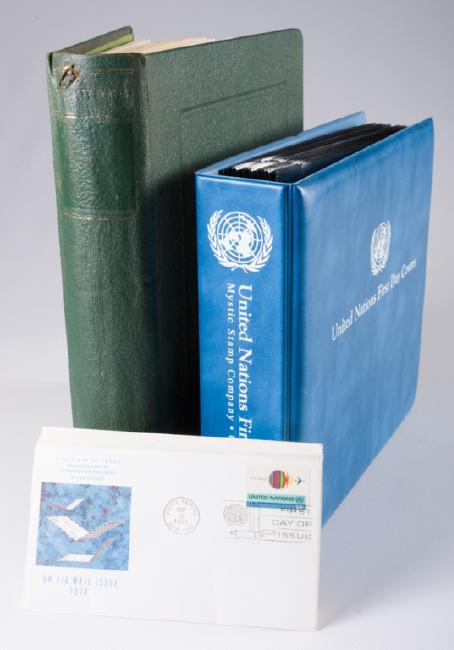 One Scott's album of United Nations philatelic material including stamps, first day of issue envelopes and postcards. One United Nations First Day Covers album and loose first day covers. Incomplete.