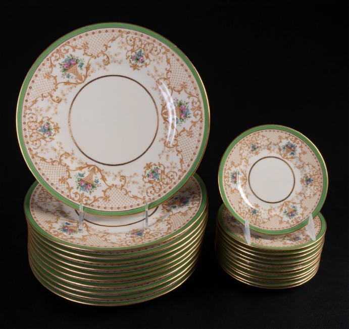 Charles Ahrenfeldt partial dinnerware of twenty three pieces to include: eleven dinner plates and twelve bread and butter plates. Dinner plates each measure approximately 11" in diameter. Marked. All with age appropriate wear and use.