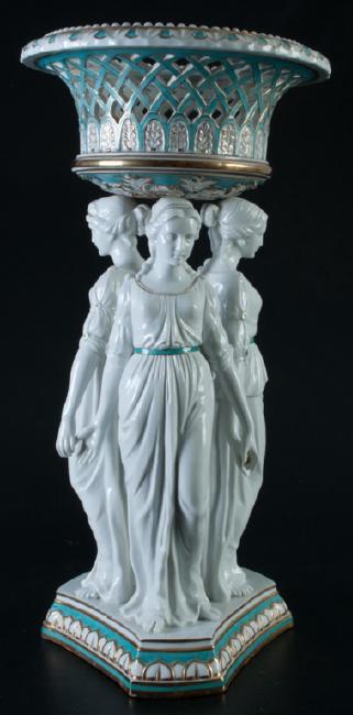19th Century porcelain “Three Graces” fruit basket in the manner of Minton, with the Graces standing back to back holding hands and supporting a reticulated fruit basket. Blanc de Chine glaze with turquoise and gilt decoration on a trefoil base; measures approximately 20-3/4” high, 8-1/2” wide and 8-1/2” in depth. Unmarked.