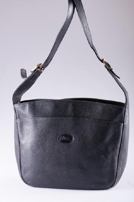 Vintage Longchamp purse of soft pebbled black leather & gold tone hardware, having one inner zip pocket, two inner non-zip pockets, one outer pocket, and key fob attached within. Has width of 13", height of 9", and base depth of 4". Strap is adjustable, at longest is 19-1/2" from shoulder to purse top. In overall good condition, with minor wear to lower edges consistent with age and use, leather could use light conditioning/cleaning. All measurements are approximate.