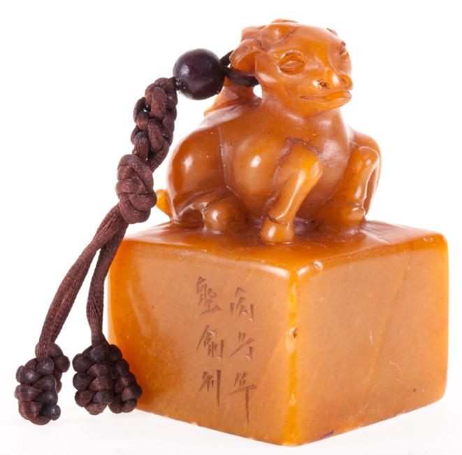 Carved jade Chinese stamp with the figure of a Milu, also known as Père David's deer. A corded tassel with a wooden bead is wound around the deer's antlers. Carved Chinese characters on the side of the base and the rubber of the seal possibly indicate the artist or original owner. Tests as jade. Measures 4" in height and square base measures 2-1/4" on each side. Weighs 13.48 ozt. All measurements are approximate. In overall good condition consistent with age.The Milu is an endangered species and an auspicious symbol of Imperial power in China dating back over 2,000 years.
