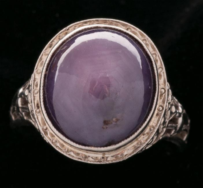 Purplish Red Star Ruby cabochon measures 10 mm x 11. 5 mm x 16.8 mm in bezel mounting. Ring is a size 5-3/4. Approximate weight is 0.16 ozt. No metal quality stamp, but tested as 14 karat white gold.