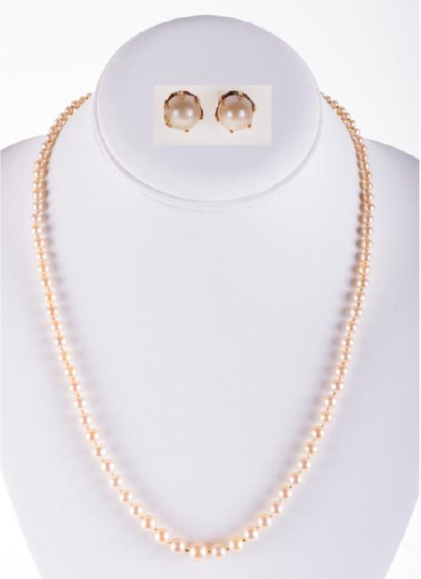 Necklace has knots in between pearls, contains a stamped 14k white gold safety clasp and measures 20". Pearls are graduated from 3mm to 7mm. Earrings are tested 14k yellow gold and contain 7mm pearls.