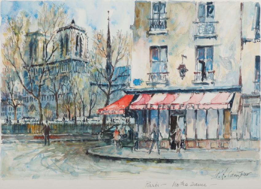 Pierre Eugene Cambier (French, 1914-2000) “Park (Parc) – Notre Dame”, watercolor depicting a street scene with a view of Notre Dame Cathedral. Signed verso and lower right "P.E. Cambier", pencil titled to lower center. Matted and framed under glass. Frame measures 14-7/8" in height by 18-1/4" in width with the sight image measuring 9" in height by 12-3/8" in width. All measurements are approximate.Pierre Eugene Cambier (French, 1914-2000) first began to exhibit his works in Paris, France in 1948, at the annual Salon des Independents. Following his success there, he joined another annual show, the Salon d'Automne, and participated in these shows from 1953 to 1960. Thereafter, his works were shown and sold at the Galerie Urban, Paris, Galerie O'Hara, London, and Galerie Sothman, Amsterdam. Cambier's watercolors - his preferred medium - show well known and characteristic locations of Paris and quotidian activities of Parisian life, as well as the symbiosis of nature and architecture in the French country-side. Cambier lived and worked in Paris as professor of drawing and illustration until his death in the year 2000.
