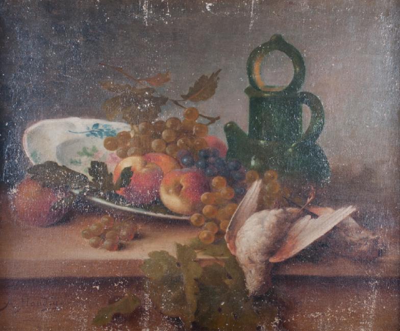 Andre Haudry de Soucy (French, 1765-1844) framed still life with fruit, bowl, jug and dead birds. Signed "A. Haudry" to lower left. Gilt frame measures 22-1/2" in height by 26-1/2" in width with the stretcher measuring 18" in height by 21-1/2" in width. All measurements are approximate.