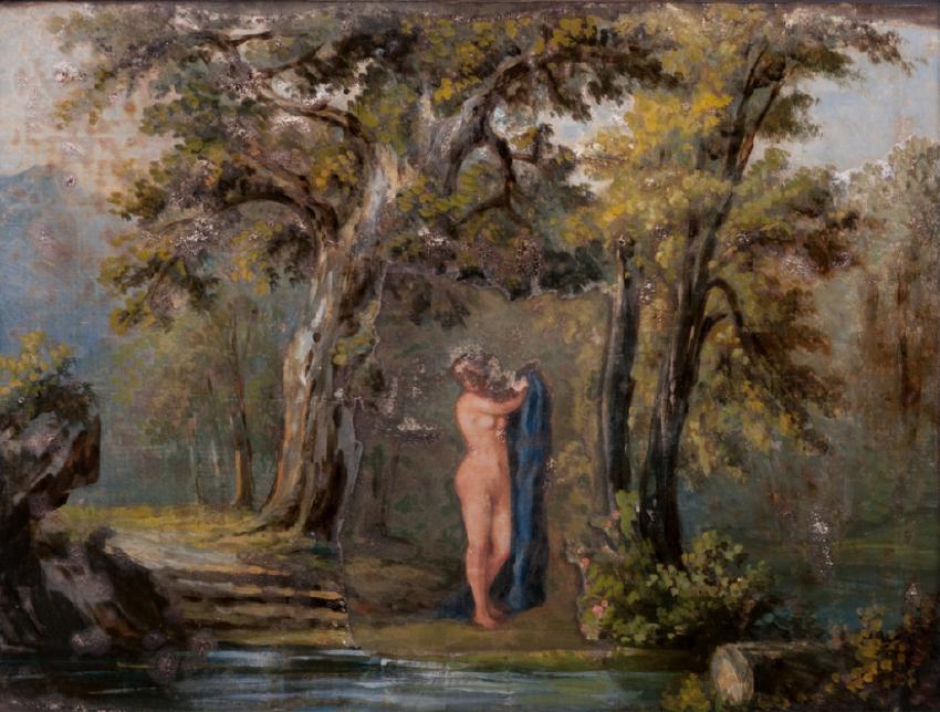 Antique reverse painting on glass depicting a forest scene and a cutout portion that slides from the image woman in a dress reading to reveal a nude woman in the forest. Frame measures 14" in height by 16-3/4" in width with the sight image measuring 9" in height by 12" in width. All measurements are approximate. In overall good condition consistent with age.
