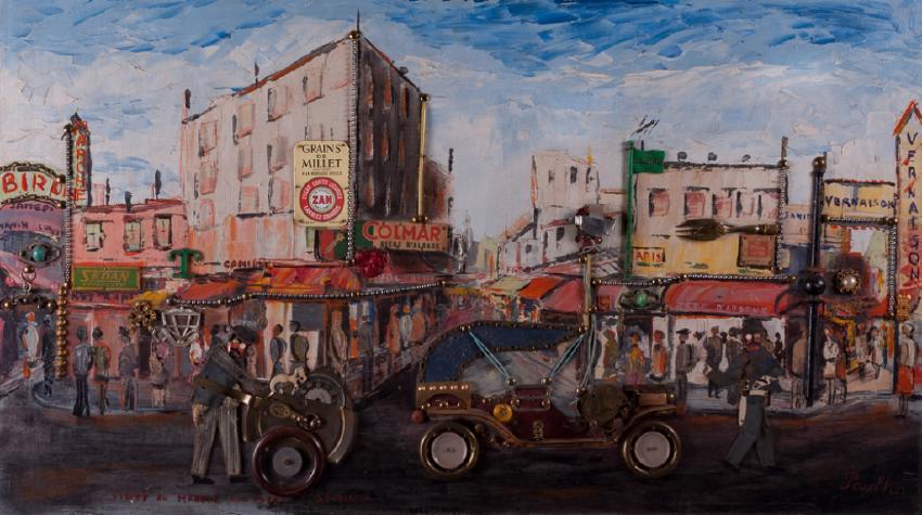 Found object three-dimensional wall sculpture on wood depicting a French street scene. Signed “Paulka” to the lower right hand corner and titled "Visite Au Marche Aux Puces St. Owen" to the lower left hand corner. Wood board measures 20” in height by 35” in width. All measurements are approximate.