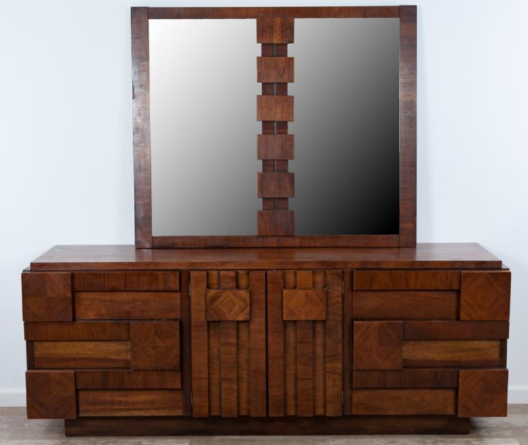 Paul Evans Inspired dresser with mirror by Lane Furniture Company featuring three drawers to left and three to right with a two-door cabinet to middle housing three additional drawers; measures approximately 71-1/2” high, 78-1/8” wide and 19-3/8” in depth. Marked “Lane Altavista, Virginia” to inside of drawer.