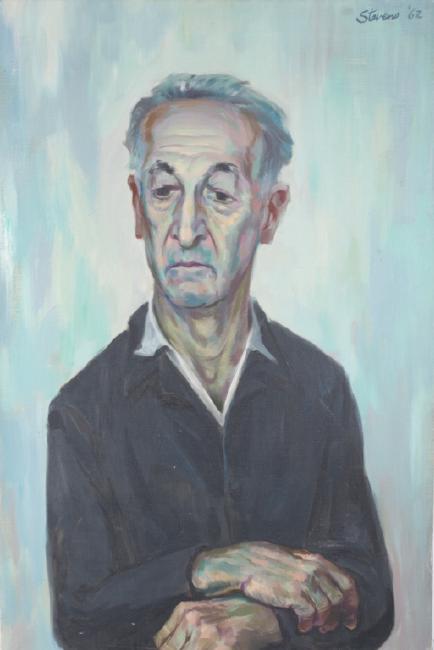 Oil on canvas fauvism style portrait of a man, signed “Stevens” and dated “’62” to the upper right hand corner. Stretcher measures approximately 30” in height by 20” in width. In overall good condition consistent with age.