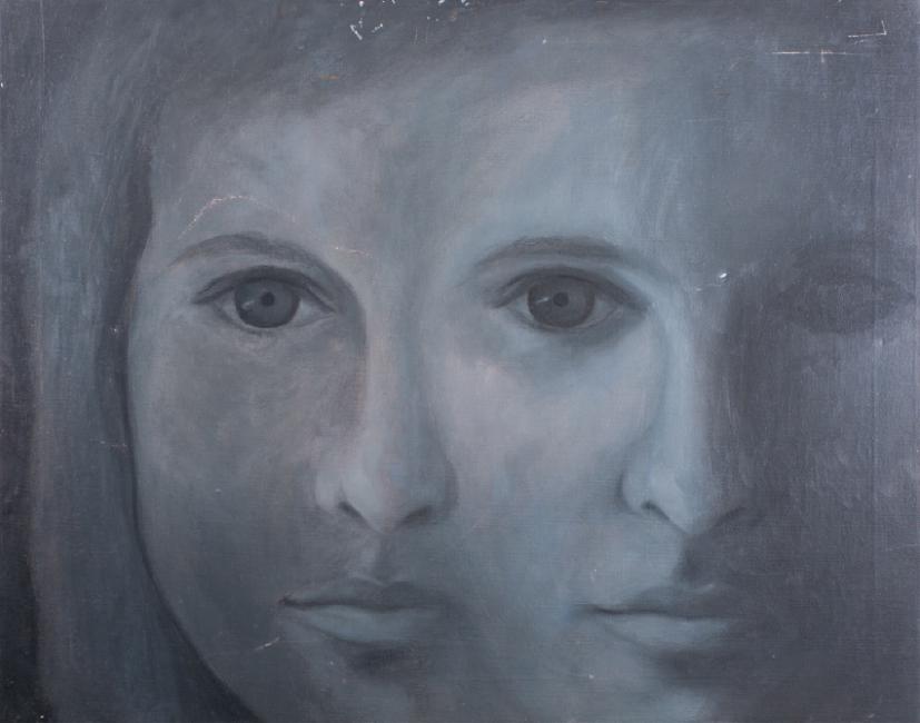 Framed oil on canvas in black and grey tones depicting one face melding into another. Open face wooden frame measures 23” in height by 28-1/4” in width with the sight image measuring 22” in height by 28” in width. All measurements are approximate. Unsigned. In overall good condition with some scratches.