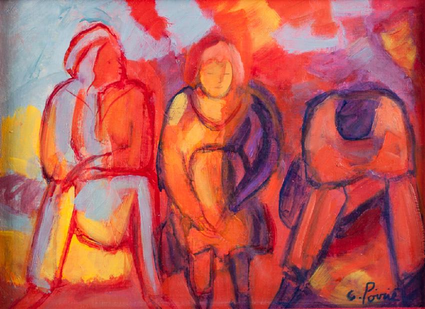 Catherine Poirie (French, ? - ) framed oil on canvas depicting three semi abstract female figures. Signed by the artist "C. Poirie" to lower right hand corner. Frame measures 11" in height by 14-1/2" in width with the sight image measuring 9" in height by 12-1/2" in width. In overall good condition. All measurements are approximate. Catherine Poirie is a Parisian artist who specializes in colorful abstracts.