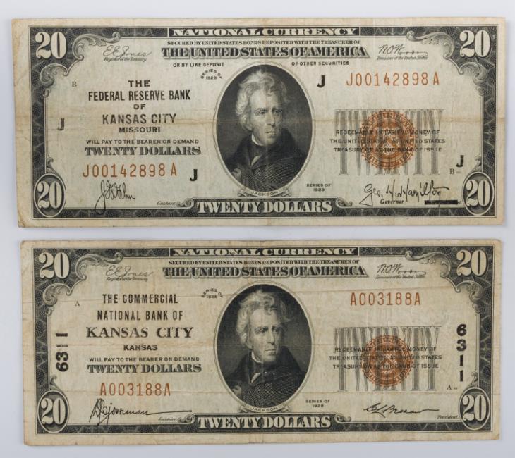 Two (2) $20 National Currency Notes, one stamped "THE COMMERICAL NATIONAL BANK OF KANSAS CITY MISSOURI" and marked "Series of 1929" with serial #A003188A. The other is stamped " THE FEDERAL RESERVE BANK OF KANSAS CITY MISSOURI" and marked "Series of 1926" with serial #J00142898A. Ungraded, but in plastic protector sleeves. In overall good condition, with wear consistent with age and use.