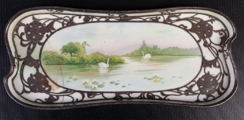 Noritake Nippon small tray or under plate with a hand painted scene of swans on a lake with silver overlay; measures approximately 5/8” high, 8-3/4” wide and 3-1/2” in depth. Marked to bottom. With hairline crack to bottom.