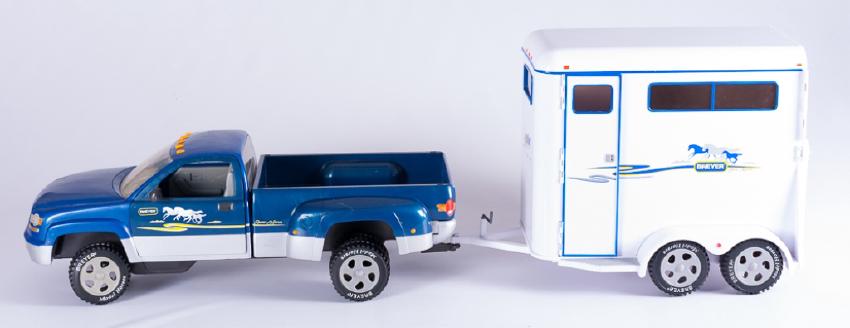 Breyer traditional truck and two horse trailer with horse, truck measures approximately 8" high and 22-1/2" in length; trailer measures approximately 12-1/2" high, 14" in length and 11" in width.