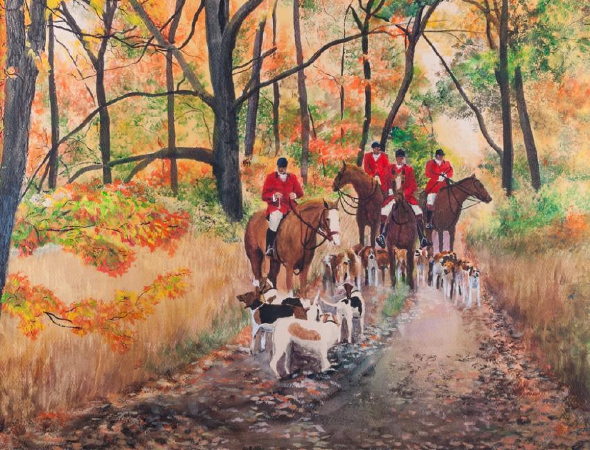 David Noll (American, 20th Century) watercolor depicting a hunt scene, matted and framed under glass. Signed by the artist and dated 1971 to the lower center of the image. Gilt frame measures 25-1/4” in height by 30” in width with the sight image measuring 17-1/4” in height by 22-3/4” in width. All measurements are approximate.