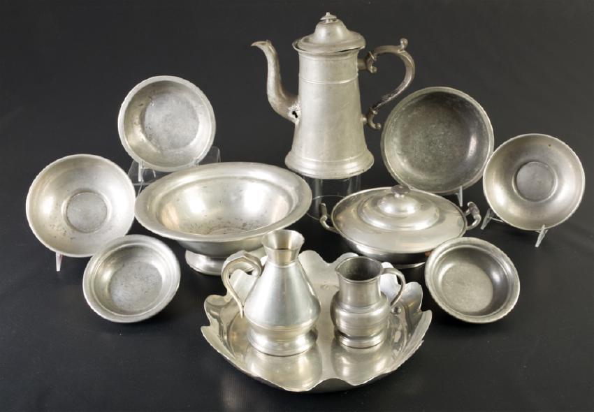 Lot of twelve American and English pewter items to include: one creamer marked "A. E. WILLIAMS PEWTER EST. 1779 GUARENTEED LEAD FREE BIRMINGHAM ENGLAND" and measuring 6" high with a base diameter of 3-3/4"; one creamer marked with the Crown and Rose and measuring 4" with a base diameter of 2-3/4"; two shallow bowls marked "PEWTER" to base measuring 1-1/2" high by 5-1/2" in diameter; two bowls marked "MODERNART PEWTER W.&S.B." and measuring 2-1/2" high by 6-1/2" in diameter; one unmarked bowl measuring 2-1/4" high by 6-3/4" in diameter; one unmarked bowl measuring 2" high by 8" in diameter; one footed compote marked "Concord Pewter" and measuring 5" high by 10-1/2" in diameter with a base diameter of 5-1/4"; one serving plate with ridged edges marked "Williamsburg Restoration Stieff Pewter" and measuring 2" high by 12" in diameter; one lidded dish marked "E-A-P PEWTER GEBELEIN Boston" and measuring 5-1/2" high with lid by 10" across with a base diameter of 4-1/4"; and one higned lidded pitcher marked "J.Munson" and measuring 10" high and 11" wide from handle to spout. All measurements are approximate. Lidded pitcher has several welding repairs, one puncture to the spout and the lid hinge is bent, collection is otherwise in overall good condition consistent with age.