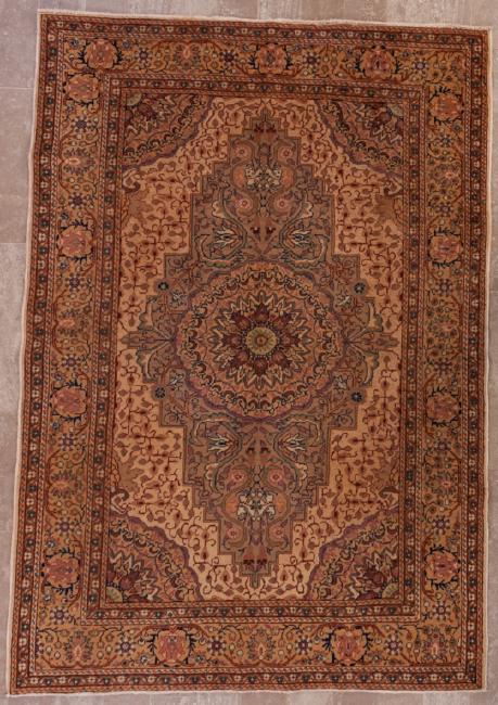Turkish Anatolian 100% wool rug from the Quiysarie region with a cream and salmon single medallion to the field, triple banded brown and cream border with an allover floral pattern; measures approximately 4'10" x 6'9". In good overall condition with age appropriate wear.