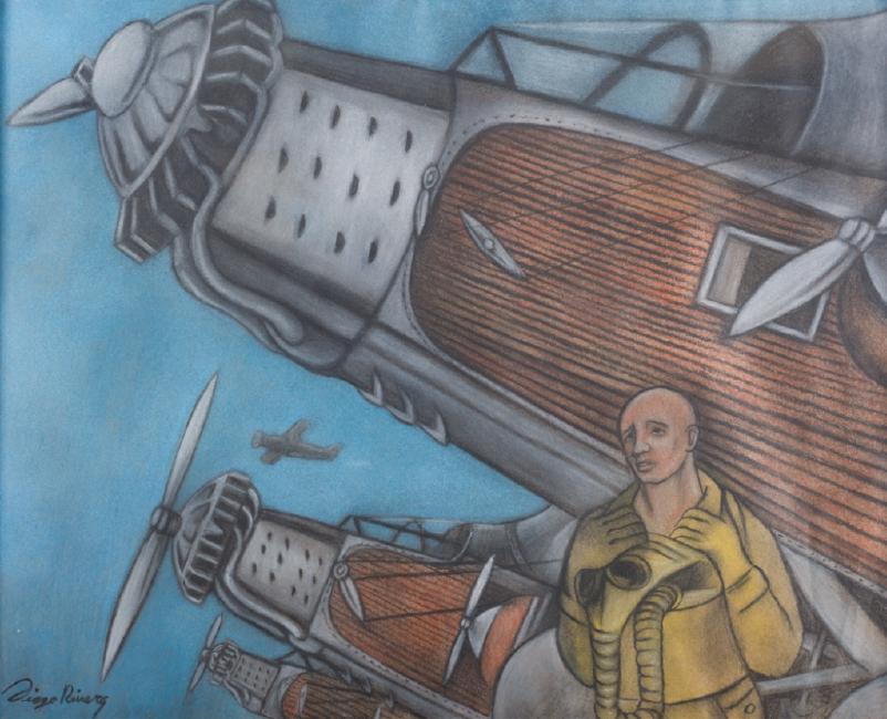Diego Rivera (Mexico, 1886-1957) mixed media drawing depicting a pilot with his airplane and others in the background, framed under plexiglass & signed to lower left "Diego Rivera". Comes complete with certificates of authenticity, please see photographs. Titled "Estudio" on COA, and was created as a study for the Detroit Industry series, at the Detroit Institute of Arts, west wall (detail). Has a framed height of 20-1/2" with width of 24-1/4", and a sight image height of 15-1/2" with width of 19-1/2". In overall good condition, all measurements are approximate. Provenance: from the state of an Ohio collector who wishes to remain anonymous.It is our recommendation that all pieces must be examined in person by perspective clients or a dealer they have asked to give them a condition report. This is consistent with our terms of sale that all goods are sold as is and all sales are final.For information about this artist, please refer to lot #75 in this catalog.
