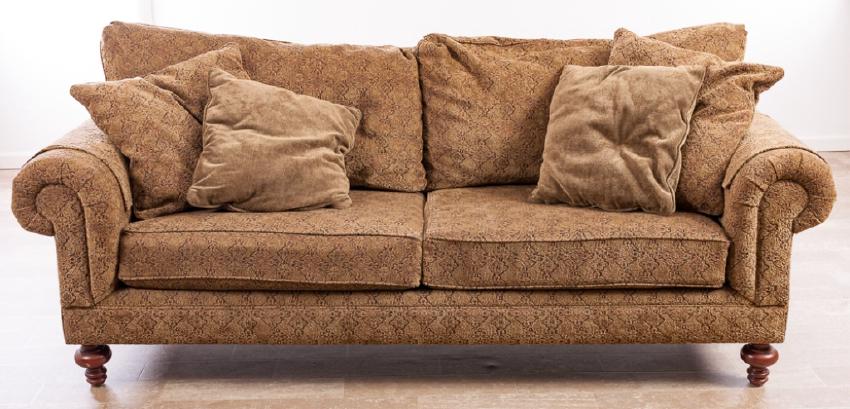 Henredon Upholstery Collection sofa with Lawson arms, multi pillow back and chenille tapestry upholstered fabric resting on turned front legs and blocked back legs; measures approximately 33-1/2" high, 87-1/2" wide, total depth of 37" with a seat depth of 21-3/4" and seat height of 19-1/2". Label tag under seat cushion.