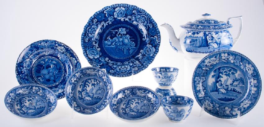 Pearlware teapot and three handleless cups and saucers with two flow blue ironstone plates; teapot measures approximately 5-1/2” high, 10” wide spout to handle and 5-3/4” in depth.