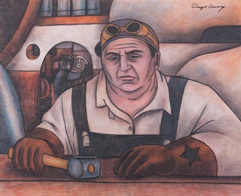 Diego Rivera (Mexico, 1886-1957) unframed sanguine, chalk and charcoal on paper mural study for the Detroit Industries Mural, commissioned by Henry Ford and executed between 1932-1933 as a tribute to the American Worker. This piece was completed in 1931 and depicts an industrial worker with a star on his welding glove. Signed "Diego Rivera" to the upper right hand corner and measuring approximately 18" in height by 22" in width. Comes complete with a letter of provenance from an owner whose family was given the piece by the actor Jack Benny. Also included is the original receipt of sale to Jack Benny (spelled 'Beny' on the form), dated March 12, 1942 and signed by Diego Rivera. For more information regarding this artist, please refer to lot #25 in this catalog. It is our recommendation that all pieces be examined in person either by perspective clients or a dealer the client has asked to give them a condition report. This is consistent with our terms of sale that all goods are sold as is and all sales are final.