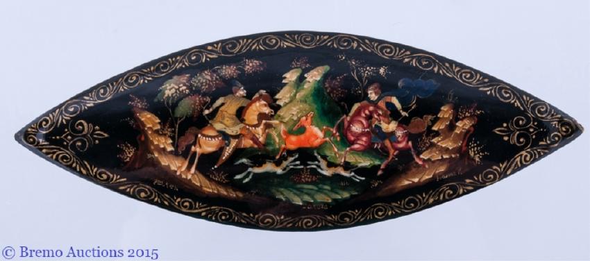 Beautiful oblong-shaped box titled "Hunting" and signed by artist "Ivina" at bottom; depicting a hunting scene with two hunters and dogs cornering a deer; measures approximately 1-1/2" tall, 6" wide, and 2-1/4" deep.