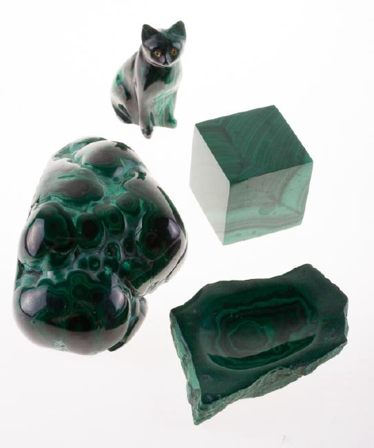 Cat measures 2-1/8" in height, 1-3/8" in length, 1" wide. Cube measures 1-3/8". Small concave fragment measures 5/8" in height, 2-3/4" in length, 2" in width. Larger geode fragment measures 1-3/4" in height, 4" in length, 2-3/4" wide. All have a combine weight of approximately 34.16 ozt.