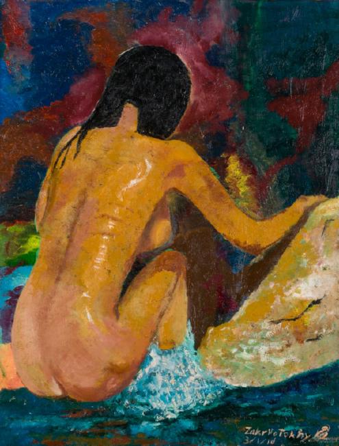 Framed oil on canvas depicting a nude female from behind climbing in or out of water. Signed "Zakriia Tukhi" to lower right and signed "Gulam Zakriia Tukhi" to verso. Dated "3/1/10" to lower right and verso. Open face frame measures 30-1/2" in height by 26-1/2" in width with the sight image measuring 19-3/4" in height by 15-3/4" in width. All measurements are approximate.