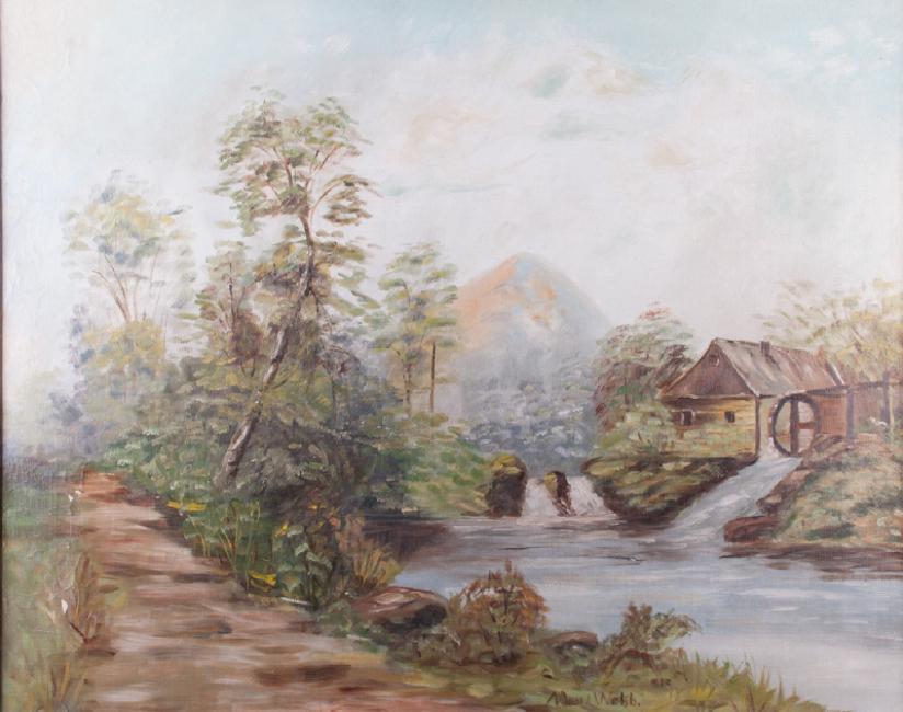 Framed Maud Webb oil on canvas painting of a mill, signed to lower edge. Measures approximately 20-3/8" in height by 24-3/8" in width with a sight image of approximately 15-3/4" in height by 19-3/4" in width.