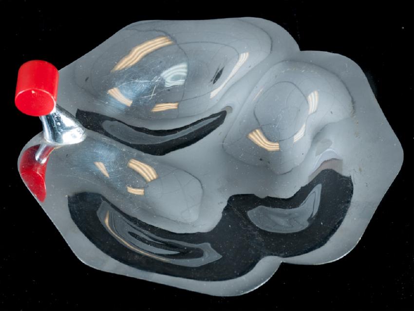Art Deco candy or nut dish with a red Bakelite handle, manufactured by Continental Chrome; measures approximately 2-3/8” high and 7” in diameter. Marked “Continental Chrome” to the bottom.