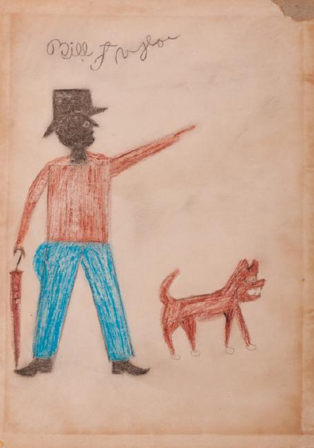 Vintage Modernist style colored pencil & graphite drawing, signed to top left "Bill Taylor", unframed. Sketch is drawn on what appears to be the inside of the back of a book cover. Depicts a man and his dog, and measures 12" in height with width of 8-1/2".