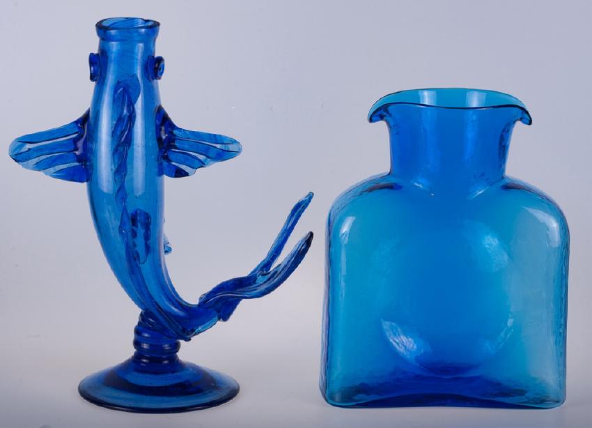 Blown molded blue double spouted carafe, marked “Blenko 2006” to the bottom. Together with a free blown blue bud vase in the form of a fish, unmarked, with chipping to the rim. Bud vase measures approximately 10” high and 4-1/4” in diameter to the base.
