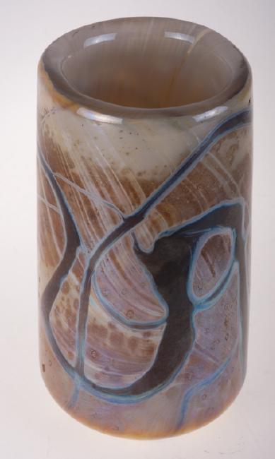 Art glass vase in sepia tones with metallic oxide accents throughout. Signed "RW Stephens" and dated "78" on the bottom. Vase measures 5" in height with a base diameter of 2-3/4". All measurements are approximate.