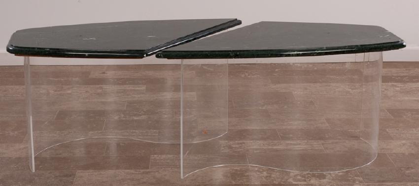 Pair of tables, each with an acrylic “S” shaped base and green solid marble tops with a finished ogee edge, can be used separately as end tables or can be placed near each other to create a two-piece coffee table; measure approximately 17” high, 32” wide and 21” in depth, each.