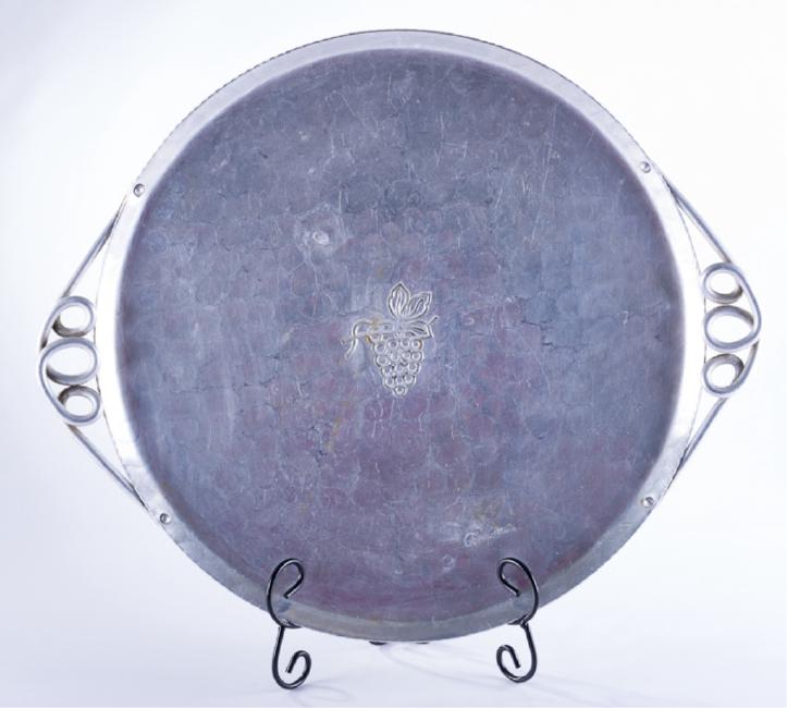 Hammered Buenilum tray with grape cluster motif; marked to bottom "Buenilum Hand Wrought"; measures approximately 17-1/2" in diameter and 20-1/2" wide from handle to handle; in good overall condition with some wear throughout.