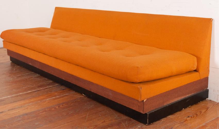 Craft Associates plinth base sofa attributed to Adrian Pearsall with orange upholstery. Has one large cushion. Measures approximately 26" high, 95-7/8" wide, 31" in depth, and seat height of 15-1/2". Marked Craft Associates to tag. In good condition, consistent with age and use.
