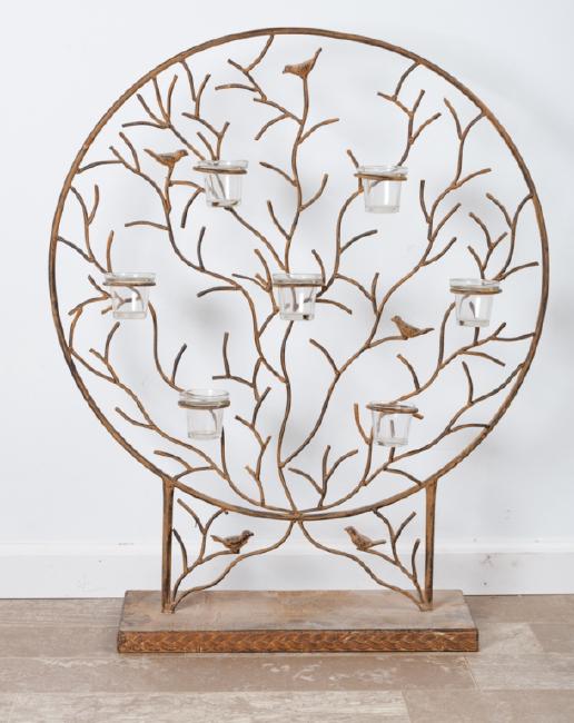 Circular wire metal frame with seven glass tea light candle holders nesting among twigs and birds, mounted on a stand; measures approximately 34” high and 27-3/4” in diameter. Apparently unsigned. One tea light holder appears to be a replacement.