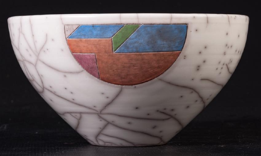Hand crafted pottery bowl, off white with crackle glaze and matte color insert; measures approximately 4" high and 7-3/4" in diameter. Signed "Pounine 1987, Canada" to the bottom.