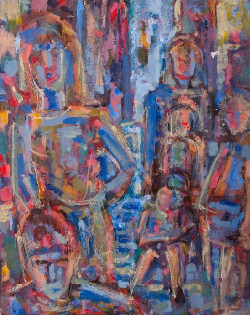 Oil on panel painting depicting semi-abstract human figures in an open face frame. Wooden frame measures 21" in height by 16-3/4" in width with the sight image measuring 19-1/2" in height by 15-1/2" in width. All measurements are approximate. Unsigned. In overall good condition with minor chipping.