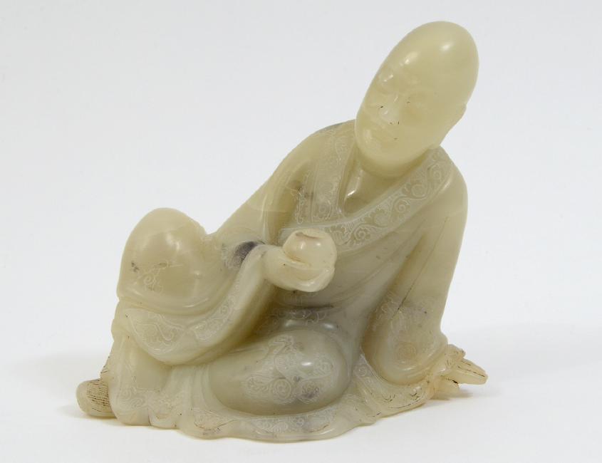 The pale green with gray inclusions figure clad in a flowing robe holding a bowl, with a fitted box. Height 2 ¾”. Width 3”. (Cond: good) (500/700)