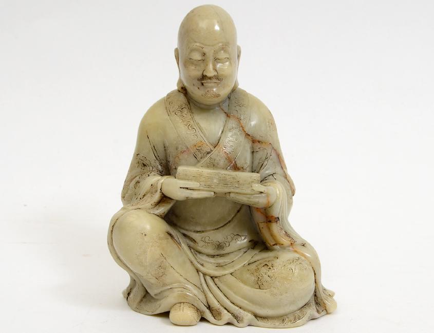Late 19th/Early 20th Century. Uniformly grayish celadon in color, the seated figure in a long robe, presenting or contemplating the contents of a box. Height 4 ½”. (Cond: good, finely detailed, nice color, good quality all around) (600/800)