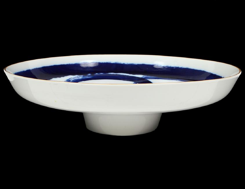 Danish. B & G factory marks, HK within an oval in under glaze blue. The large shallow bowl decorated in the recess by Henning Koppel, with an overall interlaced circular motif in blue, on a raised circular foot. Height 5”. Diameter 18”. (Cond: good) (800/1200) Cf. Henning Koppel, (1918–1981) was a principle designer of jewelry for Georg Jensen, Silversmiths, from 1945 through 1981. Besides his ‘biomorphic’ designed jewelry he was also known for a mainstay of decorative arts designs reflected in what was to become known as the “Danish Modern” style.