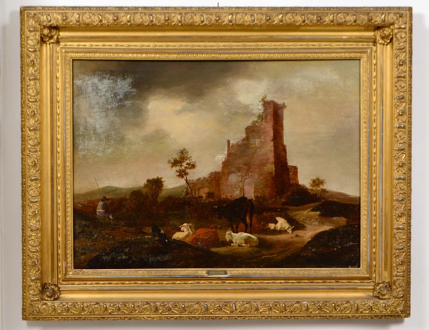 “Animals Resting Near Ruins”. Oil on Cradled Panel. Measuring 23 3/4” by 35”. Giltwood and gesso frame. (Cond: crazing, scuffing, paint loss) (800/1000) Provenance: Sotheby’s New York Sale 1129, June 13, 1985.