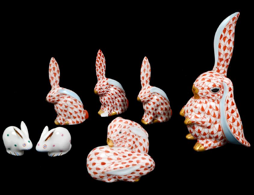Modern. The undersides marked. Five with an iron red pattern, gilt highlights, and two smaller with dots. Heights smallest to largest ¾” to 4”. (Cond: one small rabbit with a chip to the foot) (300/500)