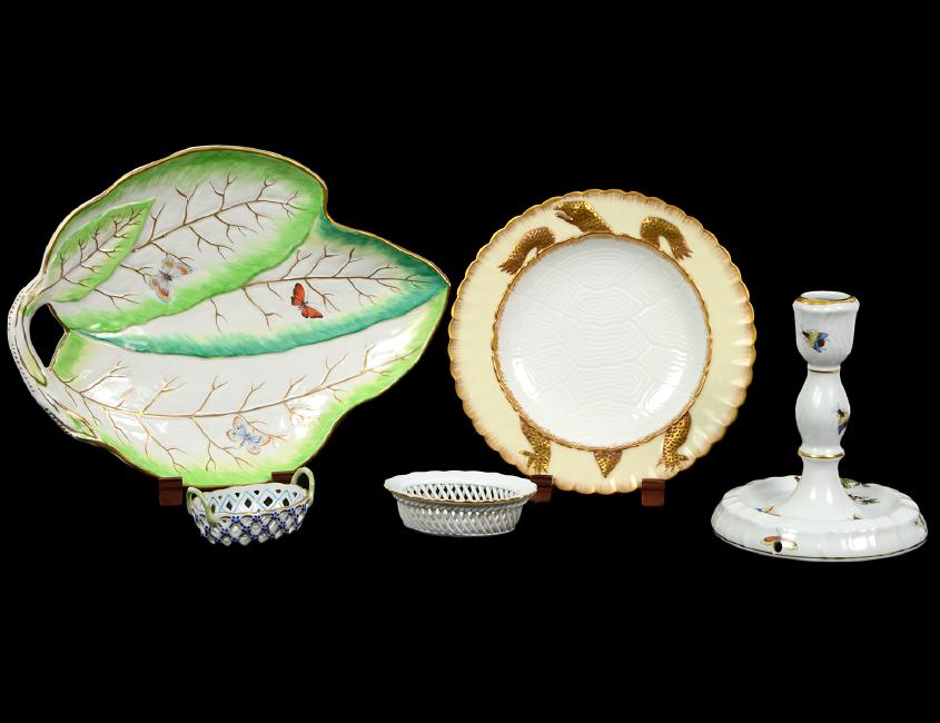 20th Century. Marked on the undersides. Comprising: a Mottahedeh Chelsea style leaf-form dish, two Herend reticulated nut dishes, a Herend “Rothschild Birds and Butterflies” candlestick and a molded and parcel gilt ‘turtle’ soup bowl. Width of leaf dish 11 ½”. Height of candlestick 6”. (Cond: minor wear to enamel on leaf dish, candlestick drilled at the base for a lamp, possibly lacking a two-light arm) (300/400)