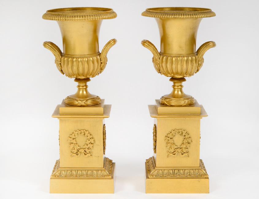 Late 19th/Early 20th Century. The Campagna form two-handled urns raised on a tall stepped square plinth. Height 9 ½”. Width across handles 4”. (Cond: good) (200/300)