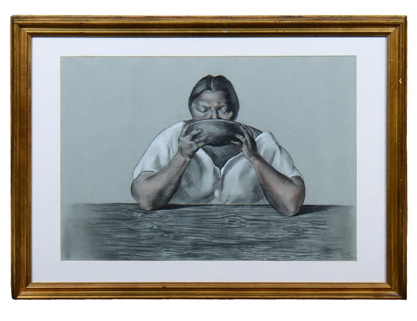 “Woman Drinking from a Bowl”. Signed l/r. Dated 1970. Pastel on Paper. Measuring 20 1/2” by 27 1/2”. Framed under Plexiglas. (Cond: good) (2000/2500)