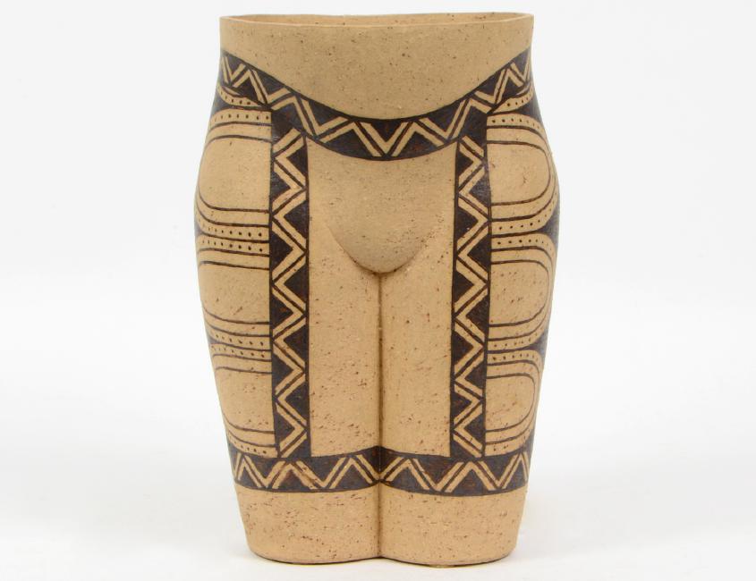 Modern. Inscribed. Karaja cultural craft. Representing the human body from the waist down, the buff colored vessel decorated with geometric linear motifs. Height 13”. Width 7 ¼”. (Cond: good) (50/100)
