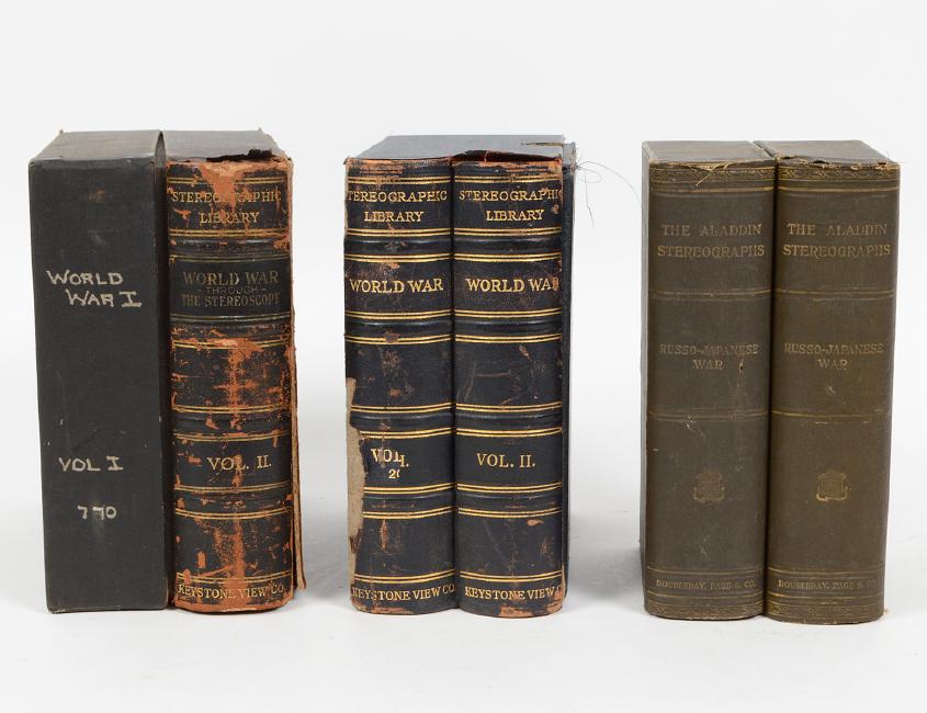 Comprising 49 Aladdin stereographs cards of the “Russo-Japanese War” and 200 Keystone View Company “World War” stereograph cards. (Cond: good, two exterior boxes with damages, sets incomplete) (300/400)